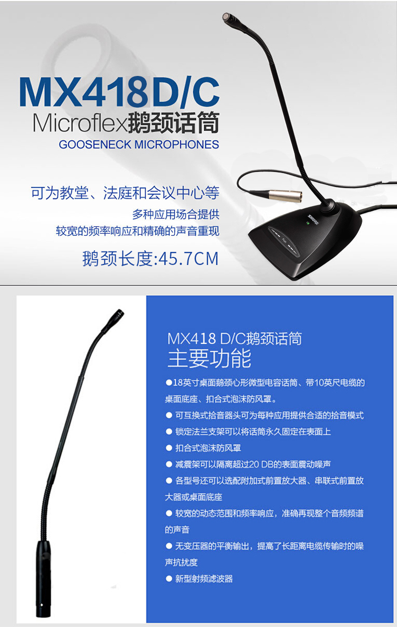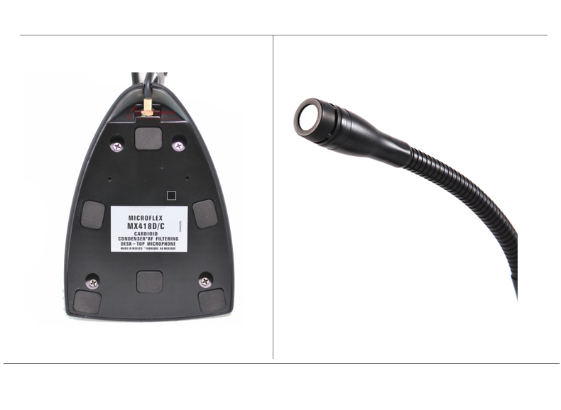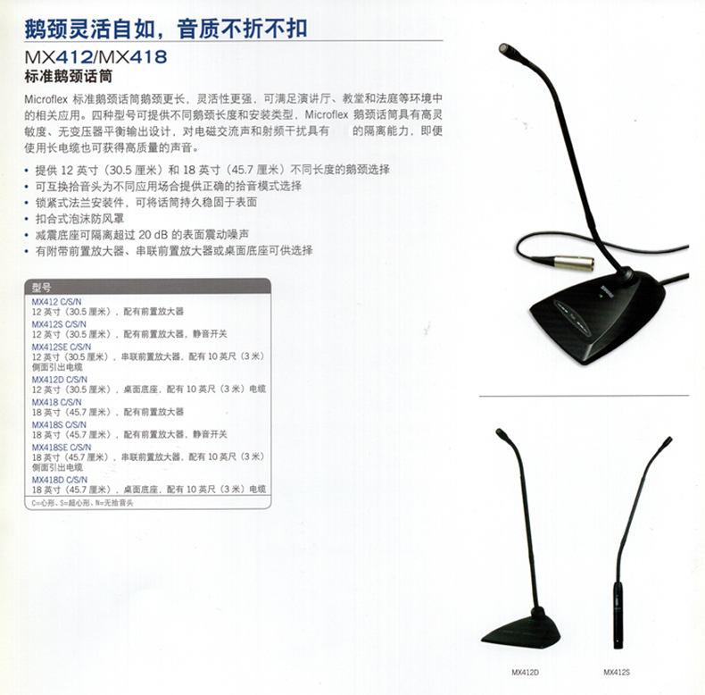 Microflex鵝頸話筒共有四種型號(hào),話筒高度和安裝方式各不相同,但都配備舒爾Microflex特有的帶LED指示燈的靜音開關(guān)。每款Microflex鵝頸話筒都具有高靈敏度和不帶變壓器的平衡輸出,極大程度提高了對(duì)電磁交流聲和射頻干擾的抗擾度,即使是長(zhǎng)距離電纜傳輸也沒有問題。每款Microflex鵝頸話筒都隨附完整的安裝套件,包括金屬鎖扣件和泡沫防風(fēng)罩、扣合式話筒減震架轉(zhuǎn)接頭。